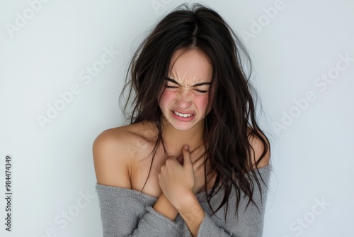 A highly emotional portrayal of a young woman squeezing her chest tightly, with an intense facial expression, suggesting feelings of distress and apprehension.