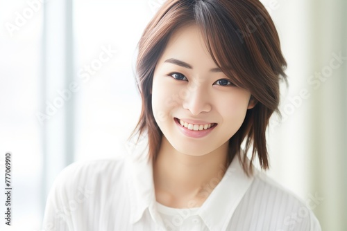 a Japanese woman's radiant smile in a meticulously crafted stock photo, embodying the epitome of professionalism. She is wearing white - pink pastel color on white background.