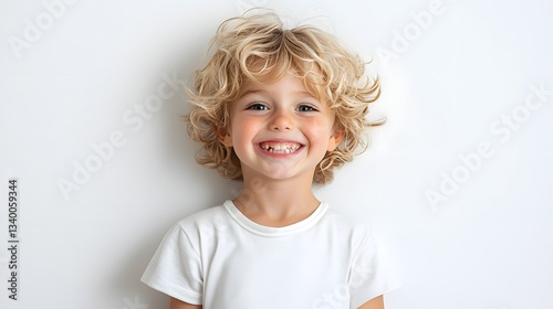 A joyful and energetic young Caucasian boy with curly blond hair beams a genuine heartwarming smile in front of a clean minimalist white background