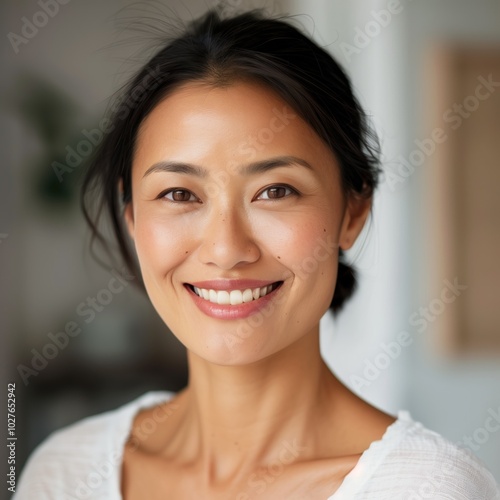 A joyful Asian woman poses in natural light, showcasing her professional look and warm smile