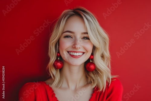 A joyful blonde woman in a bright red outfit with festive earrings smiles against a vibrant red background, capturing the essence of Christmas spirit