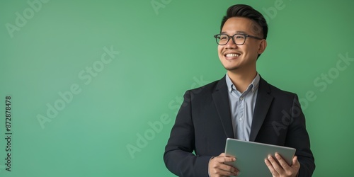 A joyful, confident young businessman in a suit, smiling with glasses and a laptop in hand.