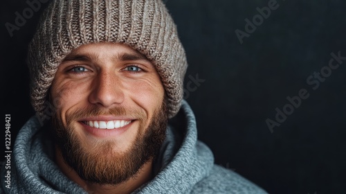 A joyful man wearing a cozy beanie hat flashes a bright smile, radiating warmth and friendliness, making viewers feel at ease and connected.
