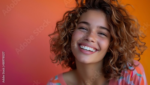 A joyful portrait of a woman with curly hair smiling brightly, perfect for lifestyle, beauty, and portrait-themed projects.