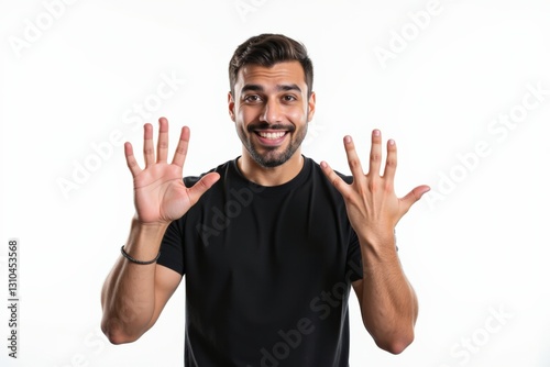 A joyful young adult male displaying ten fingers in a playful manner, showcasing excitement and engagement against a clean, minimalist background.