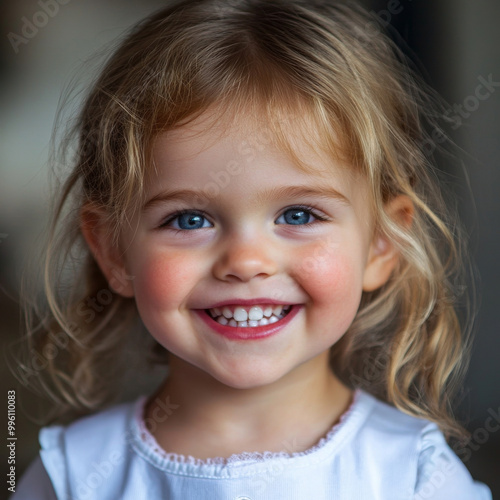 A joyful young girl with curly hair and bright blue eyes smiles warmly, radiating happiness and innocence. Her cheerful expression captures essence of childhood delight