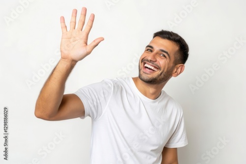 A Joyful Young Man Waving Cheerfully with a Bright Smile Against a Neutral Background