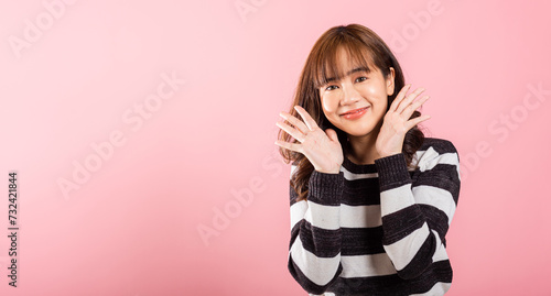 A jubilant Asian woman celebrates her victory, raising her fists with a cheerful expression. Studio shot on a pink background, conveying triumph and excitement.