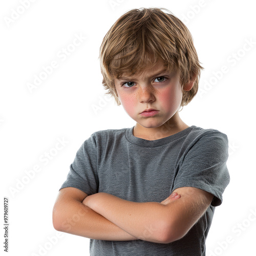 A kid crossing their arms tightly with a fierce, glaring expression. isolated on transparency background