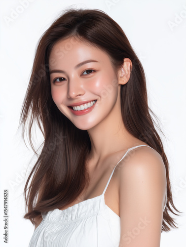 A Korean female, fair-skinned Asian beauty with delicate features, wearing a halter top and a smile. Standing against a background of light gray walls