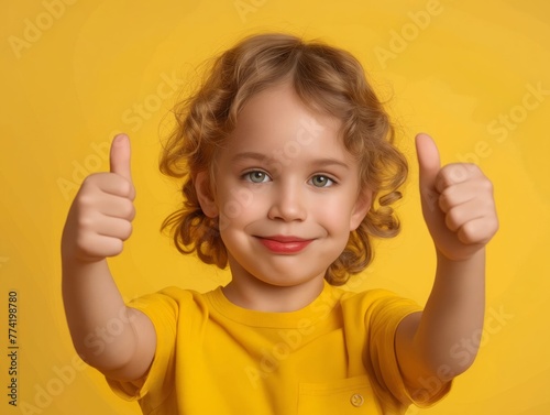 A little girl with curly hair showing thumbs up.