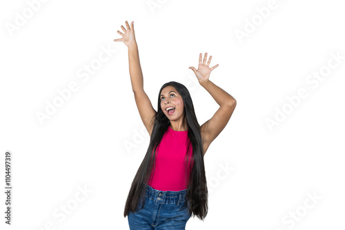 A long-haired Latina Woman Jumps Up and Down with her Hands in the Air. Gestures of Success and Smile of Achievement