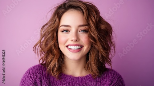 A lovely brunette woman beams with a bright smile, radiating confidence and joy. Her stylish purple sweater against a soft backdrop makes a perfect portrait setting.