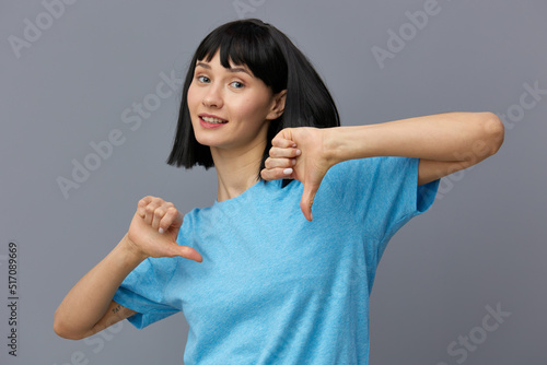 a lovely woman stands on a gray background in a blue T-shirt, happily grinning, stretching her hands a little in front showing dislike