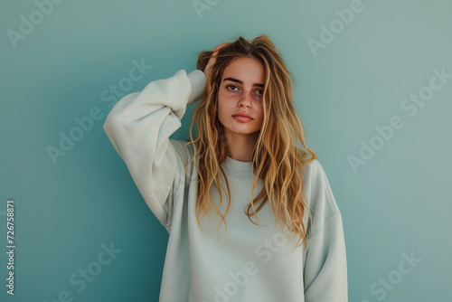 a magazine cover, minimalist photo, a woman of 20 years old, wearing sweatshirt