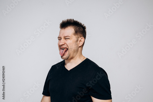 A man in a black t-shirt goofing around and squirming on camera
