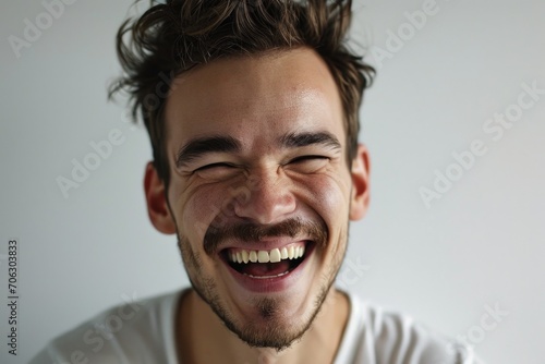 A man is captured in a moment of pure joy, with his eyes closed and a wide smile on his face. This image can be used to depict happiness, laughter, or positive emotions.