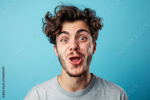 A man makes funny, sad, horrible grimaces, makes a face on a coloured background