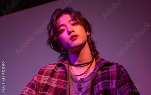 A man of mixed race standing in front of a vibrant purple backdrop, wearing a necklace