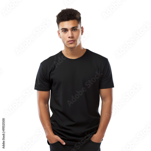A man wearing a black t-shirt against a neutral background, ideal for a design mockup, shows style and modernity