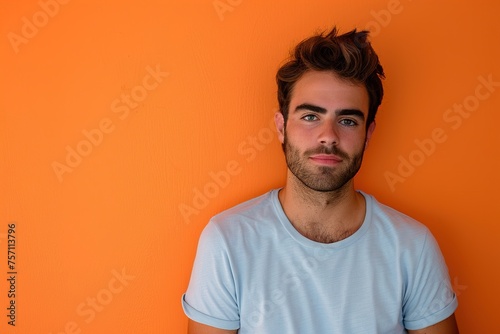 A man with a beard and a blue shirt is standing in front of an orange wall