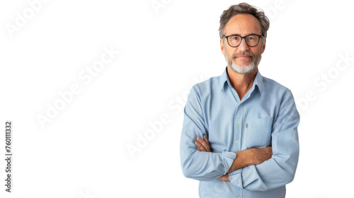A man with a beard and glasses stands confidently with his arms crossed