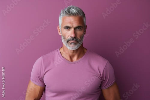 A man with a beard and gray hair is wearing a pink shirt