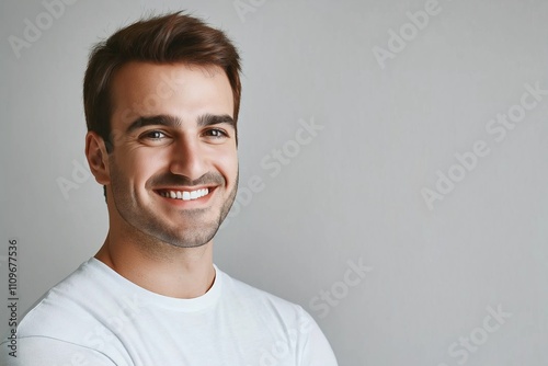 A man with a white shirt and a beard is smiling. He is looking at the camera. Concept of happiness and positivity