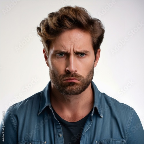 A man with furrowed brows and a stern look, his denim shirt and focused expression exuding determination and grit.