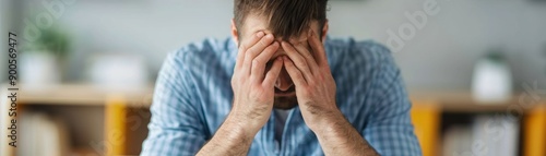 A man with his hands on his face, expressing frustration and stress in a modern indoor setting, capturing a moment of turmoil.