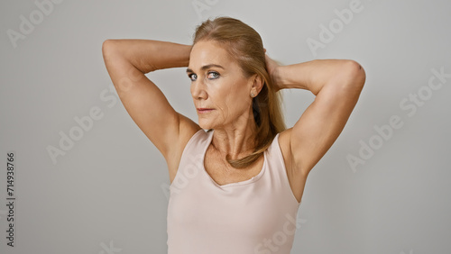 A mature, blonde woman posing confidently against a white background, evoking a sense of elegance and strength.