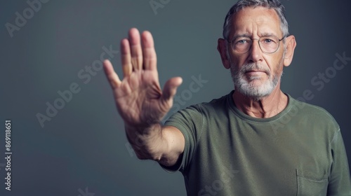 A mature man with glasses and a beard confidently makes a no gesture with his hand, promoting sobriety