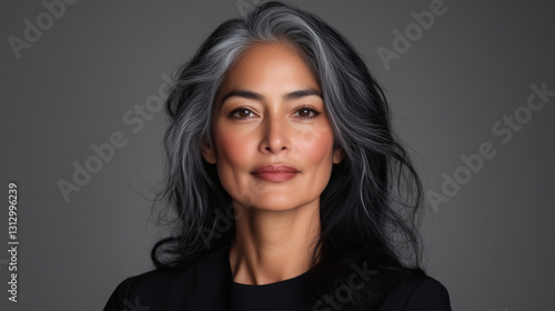 A mature woman stands confidently, showcasing her long grey hair and relaxed demeanor, set against a soft, neutral background, highlighting her poise and elegance