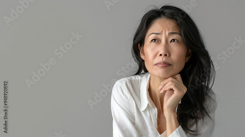 a middle age korean woman is thinking about something , having stress and worry about something , she standing on white background