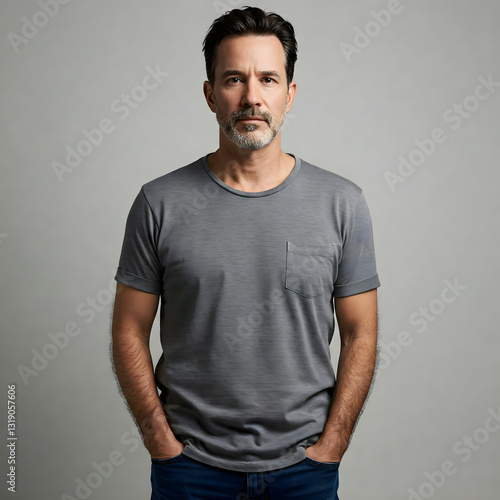 A middle-aged man in a gray T-shirt and jeans standing confidently against a neutral background. Ideal for lifestyle, personal branding, and modern masculinity themes.