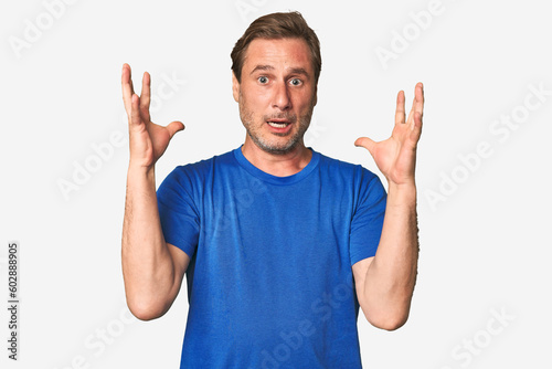 A middle-aged man isolated screaming to the sky, looking up, frustrated.