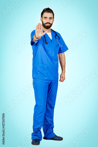 A middle-aged man-a doctor in a blue uniform on a blue background, showing a palm.