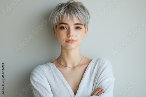 A minimalistic portrait of a Korean woman with short silver hair, wearing a white top, standing against a light gray background