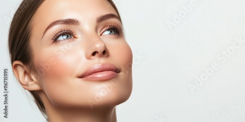 A model poses with an uplifting expression, highlighting her radiant skin and bright eyes, in a clean and simple studio background