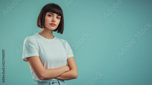 A modern fashion portrait of a confident female model with a sleek bob hairstyle, arms crossed, looking directly at the camera. Perfect for fashion and lifestyle concepts.