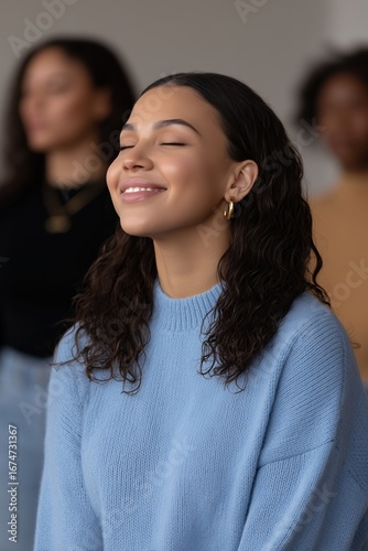 A moment of serenity captured. A woman, immersed in mindfulness, radiates peace. The gentle smile reflects a deep sense of calm and wellbeing.