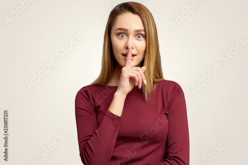 A mysterious sweet girl makes a gesture quietly, holding index finger on lips. The woman mysteriously tells the secret to her best friend, gossips about guys, asks to keep secret and remain silent