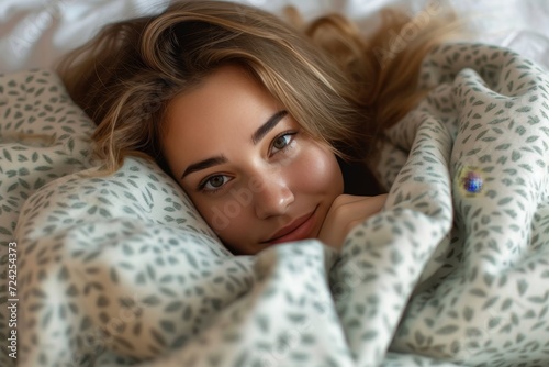 A peaceful portrait of a woman in her element, cozied up in bed under a warm blanket, her skin glowing in the soft indoor light as she prepares for a fashion photo shoot