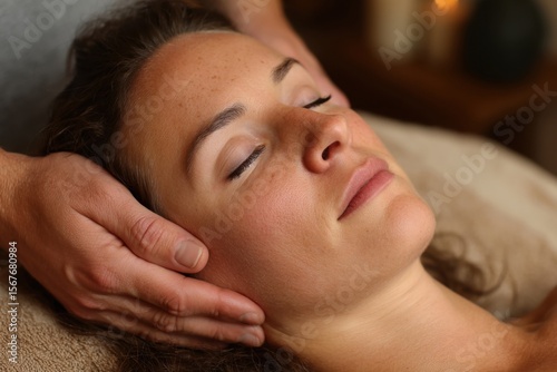 A person receives a calming head and neck massage in a tranquil spa environment, promoting relaxation and stress relief