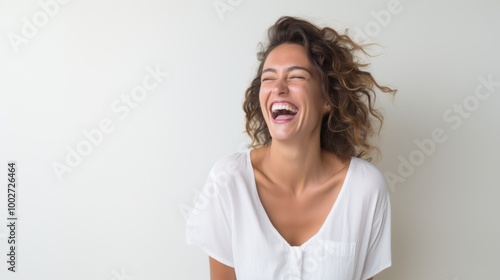 A person wearing a white shirt is laughing heartily against a light background, radiating joy and infectious happiness.