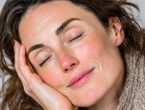 a person's face expressing relief and satisfaction after using a product or service (e.g.