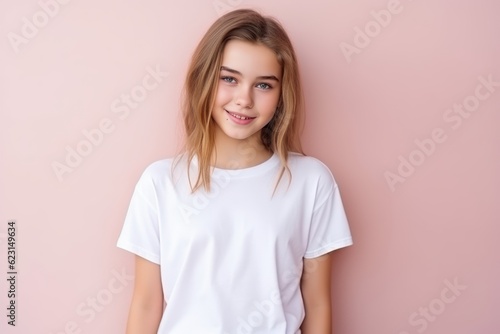 a photo of a young blonde kid girl model with a blank white canvas t-shirt. pastel pink wall background. Generative AI