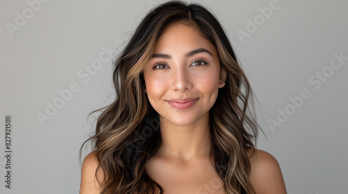 A photo of an attractive Latina woman with wavy, dark brown hair cascading over her shoulders, smiling warmly. She has large eyes adorned with bold, colorful eyeshadow and long, thick eyelashes.