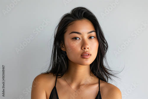 A photograph of a mixed-race woman with Korean and Latin American heritage, serene pose, straight-on angle, half-body shot. White background.