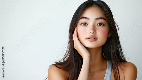 a photograph of a young asian woman with long, straight, dark brown hair, wearing a light grey tank top. she has a fair complexion, delicate features, and is touching her cheek with her left hand. the